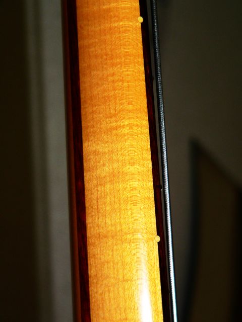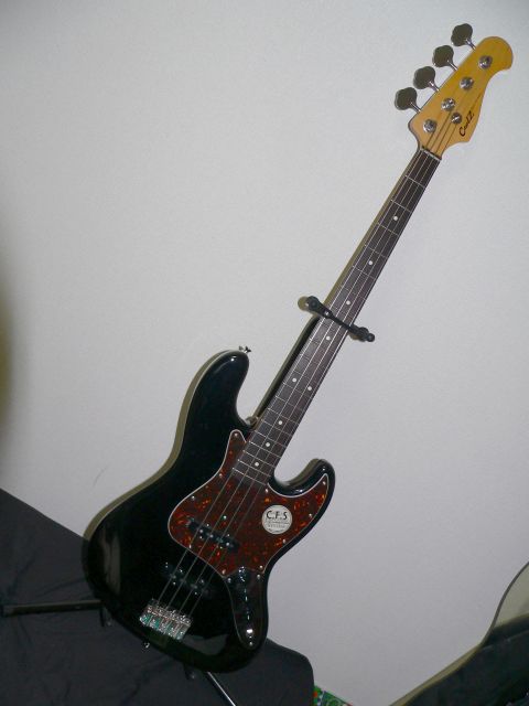 CoolZのZJB-1R、いわゆるジャズベです。渋い見た目が非常に気に入っているのですが…写真だと真っ黒だなぁ。この画像、かなり明度を上げています。撮った人がヘタだから仕方ない。