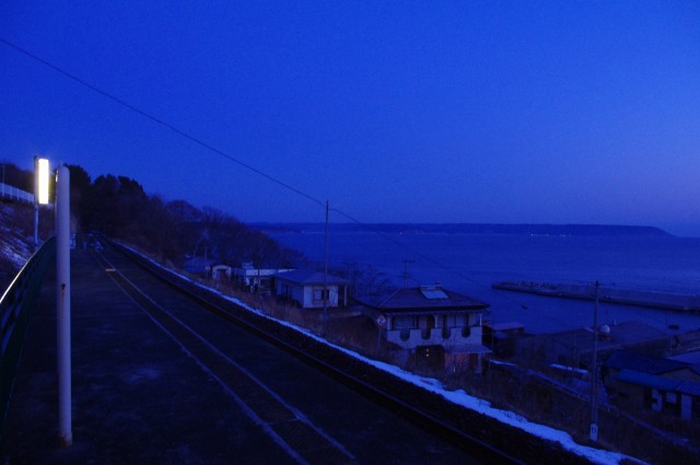 乗客は私一人。夜明け前でしたが、乗車時点で空が僅かに青みがかっていました。そして堀内の一つ手前、陸中野田を発車したあたりが青さMAXだったので、車内からパチリ。