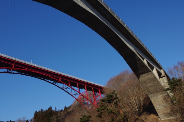堀内大橋は非常に高いところに架けられています。大型車がバンバン通るので、橋は結構揺れます。下の景色を覗き込んでいる時にトラックが通過して、ちょっとちびりそうになったのは私とアナタだけの秘密よ。