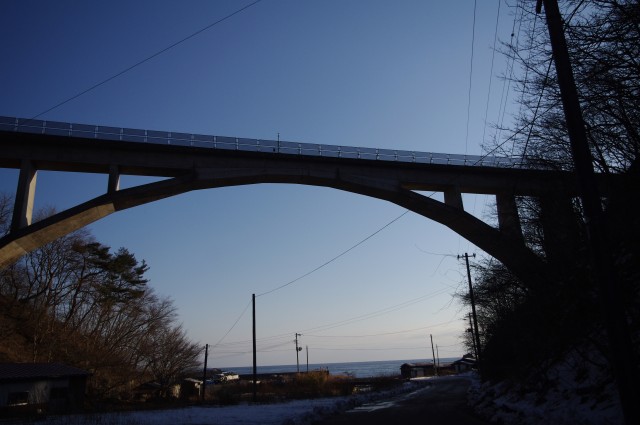 堀内駅から国道を白浜海岸・宮古方面へ歩きます。ゆるい上り坂を1キロちょっと歩くと、堀内大橋に差し掛かります。橋の上から海の方を見ると、三鉄の大沢橋梁が見えます。道路は標高の高い地上を通りますが、線路は少し低い所にあるので橋を抜けるとすぐ崖にぶつかり、トンネルに入ります。三陸鉄道の線路は多くがこのような地形を通り、そこを勾配は少なく距離も短くなるよう設計されています。旧国鉄時代に使われた労力や建設費は、大きなものだったのでしょう。