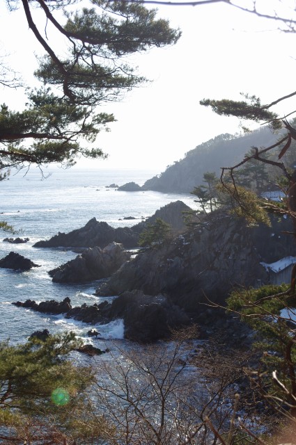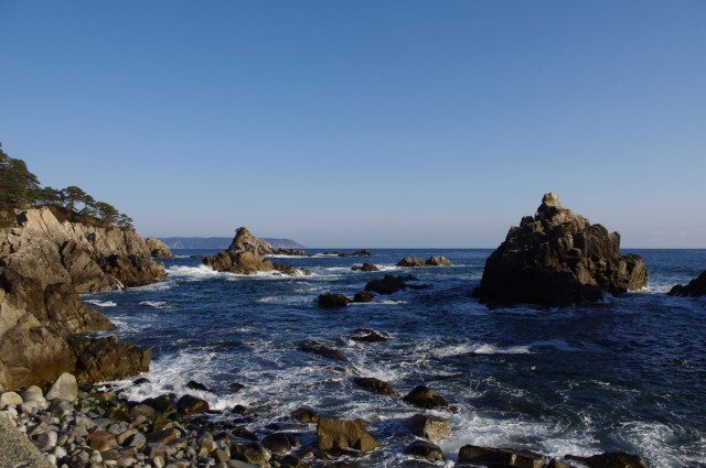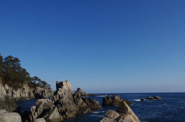 港から少し戻ったところは、このような岩場です。道路のすぐそばまで海が迫っており、一番手前には波消しブロックが。実は私、波消しブロックが嫌いです。景観の問題ではなくて。あれのおかげで波が分散されるのでしょうけど、何だか不気味な感じがするのです。