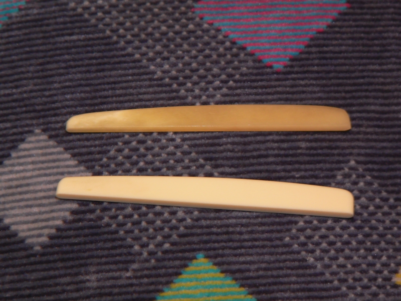 楽器屋でピックボーイの無漂白牛骨(500円)を買ってきました。普通のプラスチックで良かったのですが、元のサドルと比べてみて大きさの近い物を探すと牛骨しかありませんでした。それでも幅が1ミリくらい狭いのですが、何とかなるでしょう。