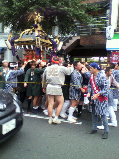 出勤の時に偶然神輿に遭遇したので、携帯で一枚撮影。車が被っちゃいました。ナンバーは流れているから見えないよね。