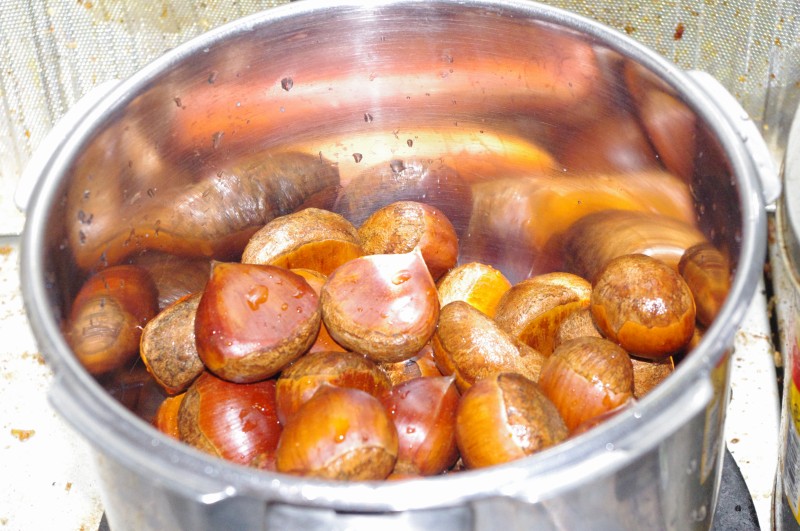 丸い栗は渋皮を残して別に煮ることにしました。圧力鍋大活躍です。