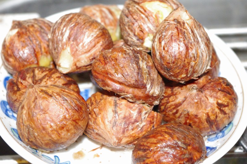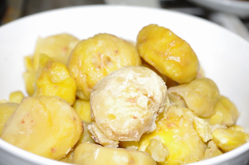 鬼皮は手でも剥けるくらいになります。楽に、とはいかないけど、オレンジの皮を剥くくらいの力でいけます。…やっぱりもうちょっと茹でた方が良かったか。乾燥すると鬼皮がどんどん固くなるので、お湯から一つずつ取り出しながら剥いていきます。