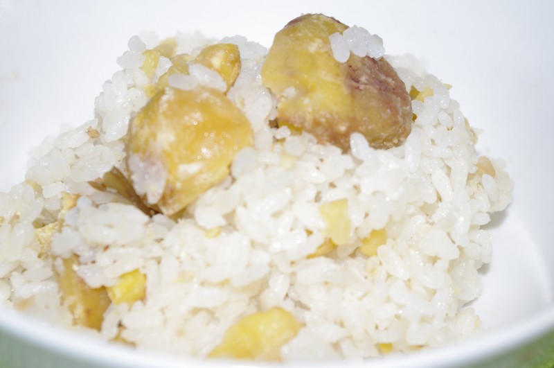 今回は炊き込みごはんにします。生栗から米と一緒に炊くのも美味しいですが、栗を甘くしたかったので、先に煮ておきました。米は水を吸わせながら、昆布を一緒に入れてダシで炊くようにします。吸水時間が過ぎたら昆布を出して、栗を入れて、いざ炊飯。震災以来ごはんを圧力鍋で炊くようになりましたが、こっちの方が早くできて味もまあまあ。