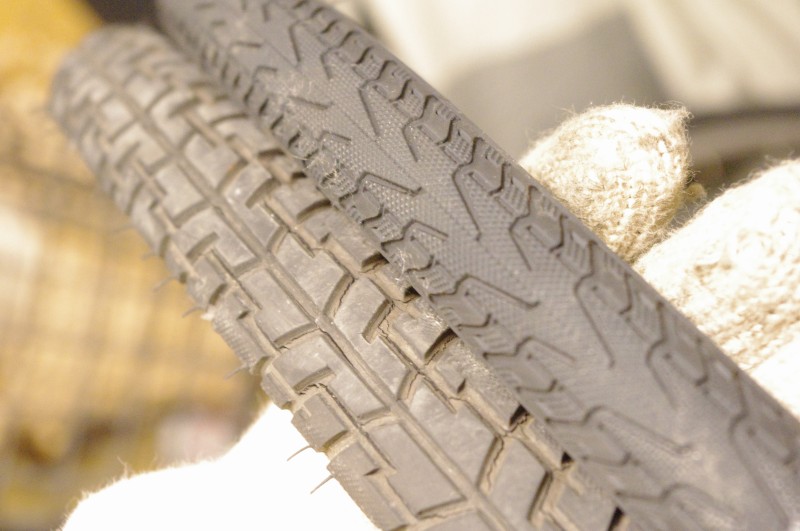 左は取り外したタイヤ。今まで良く走ってくれました。分かりにくいですが、右の新しいタイヤはちょっと細身です。