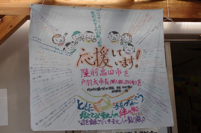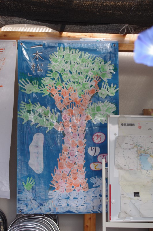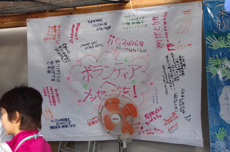 おばあちゃんは、何十人もいる私たちに、コーヒーと手作りのおにぎりをご馳走してくれました。近隣のおじいちゃんは水道を貸してくれました。道路脇の仮設店舗群には、全国の皆さんありがとう、私たちは元気です、と看板が出ていました。
