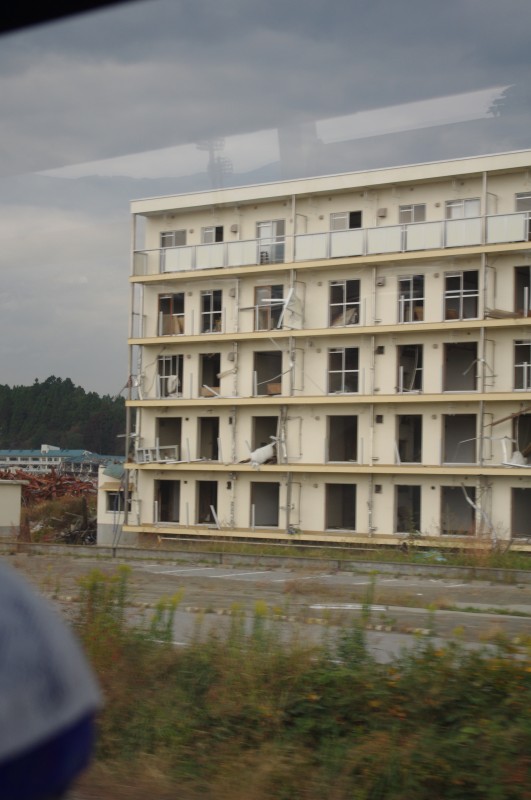 バスの車窓から、市営住宅。テレビでも放映されましたが、5階も浸水しています。
