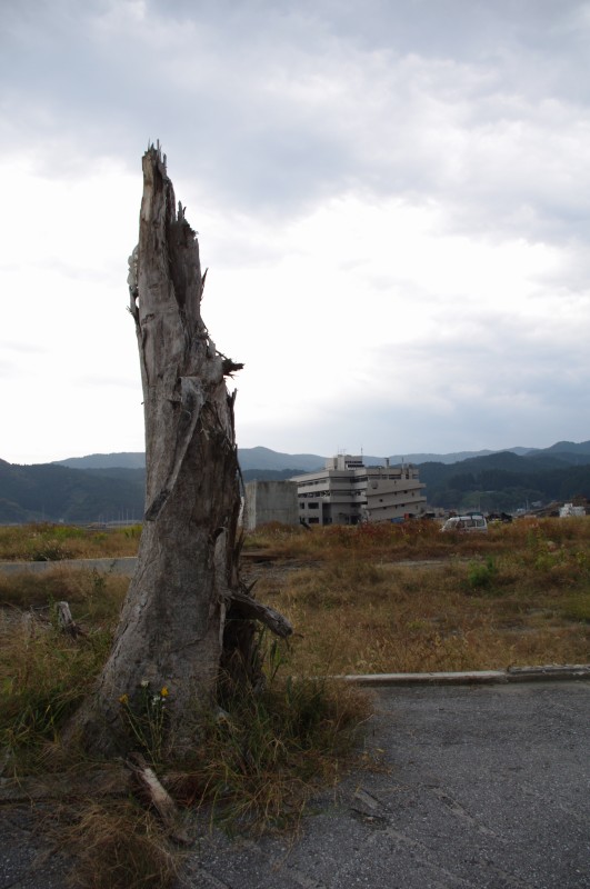陸前高田市役所。今は津波で壊された車が集められています。奥に見えるスーパーマーケット「マイヤ」は、内陸側に仮設店舗を建てて営業しています。