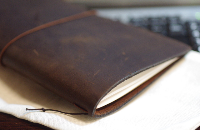 冷静に考えると、ハンズあたりで革だけ買って作った方が安いし、オリジナリティも出せたな…。今回は牛革、中身は無地。汚れていくのもまた楽しみです。